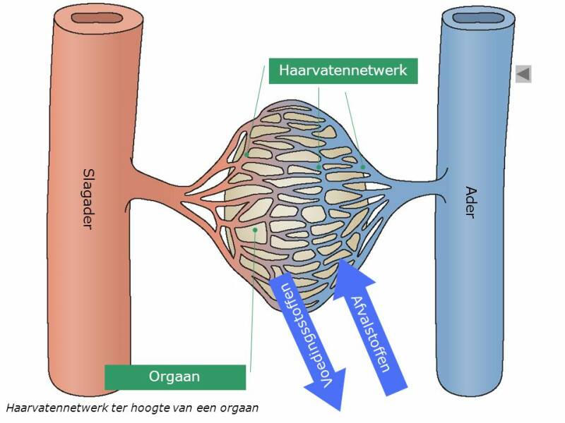 Haarvaten zijn vertakkingen van de slagaders en aders. Haarvaten zijn dun en je hebt er een heleboel van. Via de haarvaten worden zuurstof en voedingstoffen afgegeven aan de organen en afvalstoffen weggevoerd.