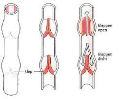 Het bloed kan wel naar de lichaamsslagader ofwel aorta. Het bloed kan niet terugstromen in het hart doordat halvemaanvormige kleppen het bloed tegenhouden.