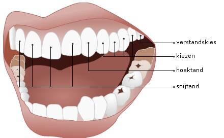 In het gebit zijn verschillende tanden en kiezen te herkennen met elk hun eigen functie.