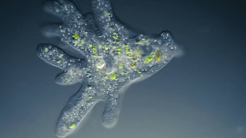 Een andere protist die je moet kennen is de Amoebe. Amoebes hebben geen vaste vorm, zij kunnen hun vorm aanpassen door hun schijnvoetjes (dat zijn die gekke uitstulpingen op het plaatje). Zij kunnen die voetjes in en uit trekken en zich op die manier voortslepen.
